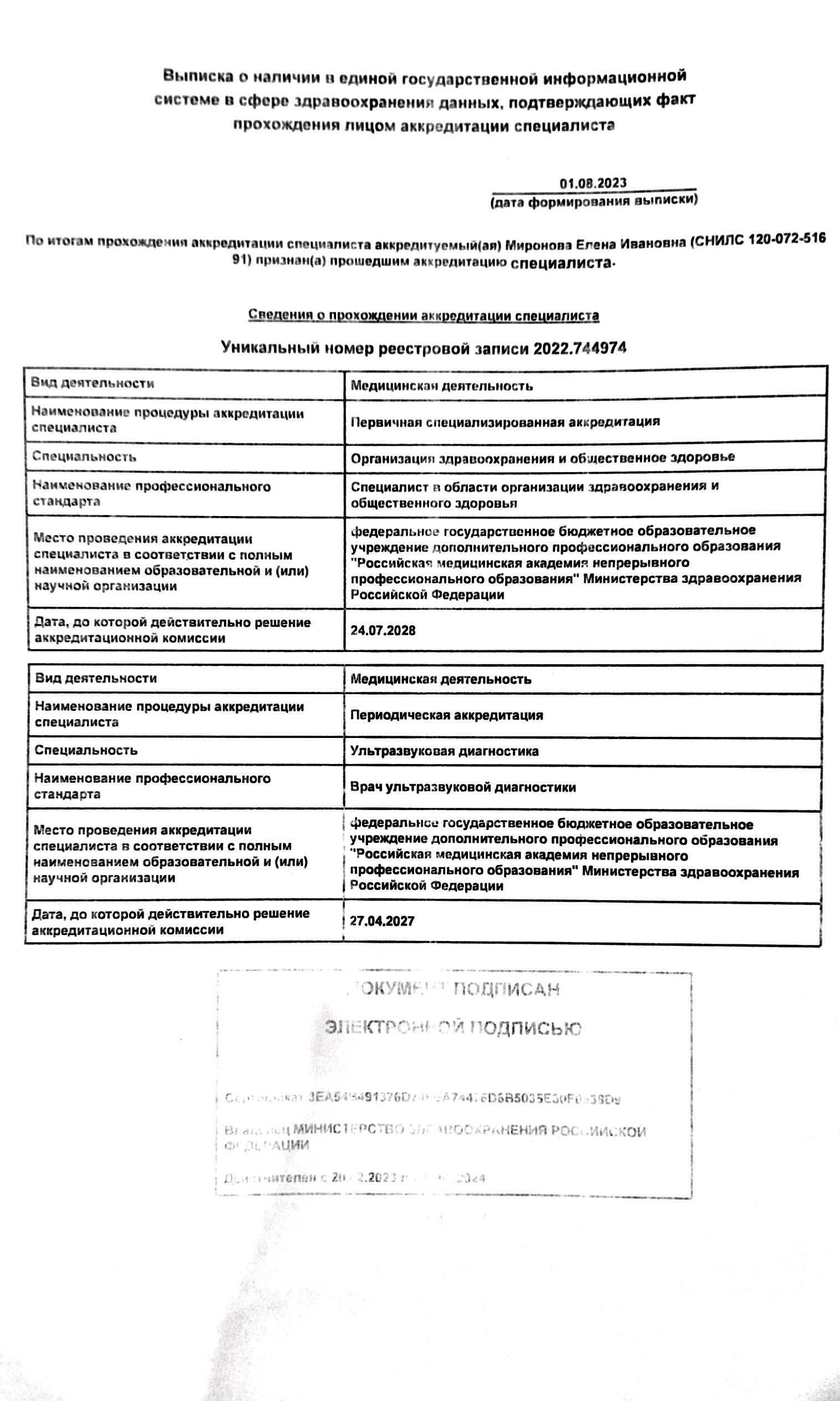 Выписка с госуслуг по аккредитации: периодическая по ультразвуковой диагностике и первичная специализированная по организации здравоохранения.