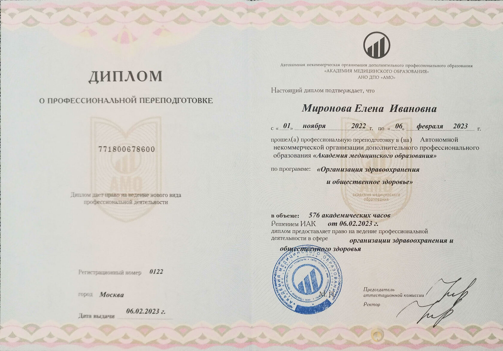 Диплом об окончании ВУЗа по лечебному делу и диплом по интернатуре.